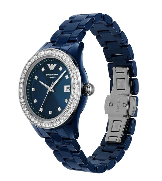 Emporio Armani Three hand blue ceramic ladies watch- AR70012