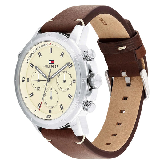 Tommy Hilfiger Brown Leather Strap Parchment Dial Men's Chronograph Watch- 1792102