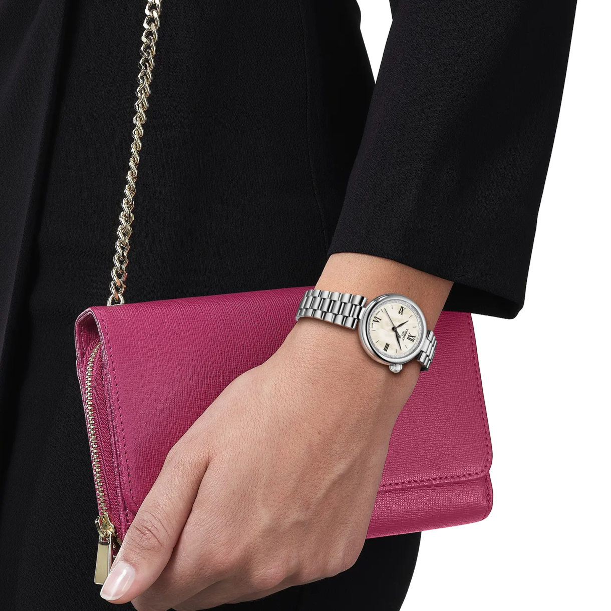 MovementFeatures EOL IndicatorMovement QuartzCaseCase Size 28 mmCase Thickness 7.68 mmCase Shape RoundCase Material SteelLug Width 4.95 mmGlass Material Sapphire CrystalDialDial Colour White MOPHands LeafIndexes Roman NumeralsStrapStrap Material SteelStrap Colour SilverClasp Type Butterfly Clasp With Push ButtonBuckle/Clasp Material SteelOtherPrecious Stone DiamondGender WomenWater Resistance (M)50